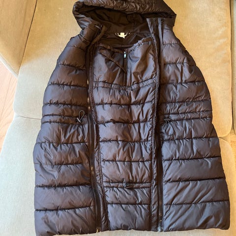 Selger ytterjakke/boblejakke for gravide som kan brukes alene eller under andre jakker. Kan åpnes i siden etterhvert som graviditeten krever det. Jakken har hette.