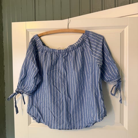 Superfin blå- og hvitstripet off-shoulder fra L.O.G.G. (H&M). Off-shoulder modell med strikk øverst og knytebånd på ermene. Laget av 100 % bomull – lett og pustende, perfekt for varme dager. Knytedetaljer på ermene gir det lille ekstra 💙