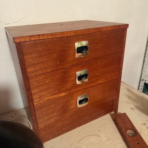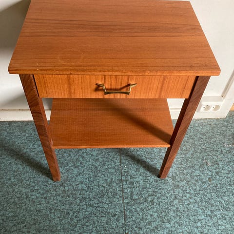 Pent teak bord som kan brukes som nattbord eller sidebord. Velholdt men noe bruksmerker, og en litt lysere flekk midt på treverket. Kan trolig pusses og oljes på nytt☺️