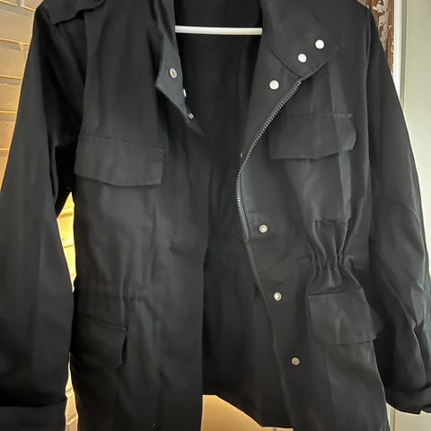 Svart jakke som kan strammes i livet. Ksn brukes vår/høst/ sommer. Lett pen jakke.