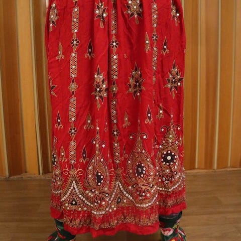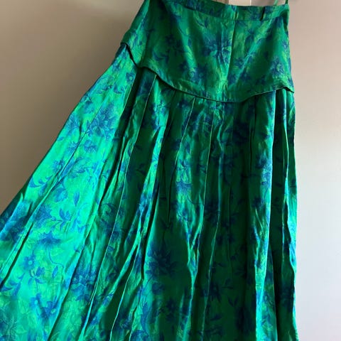 Herlig skjørt i frisk eplegrønn. Helt unikt. O indisk bomull. Rekker jeg til anklene. Oh er onesize. Strikk i livet, samt knyting. Holder seg godt. Vaskes på lav temp . Håndvask. Skjøter er ikke brukt.
