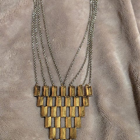 Halssmykke av messing med snor av skinn.