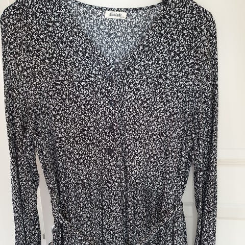 Flowy og lett stoff, bell-armer, knyting i ryggen og flatterende strikk i midjen.