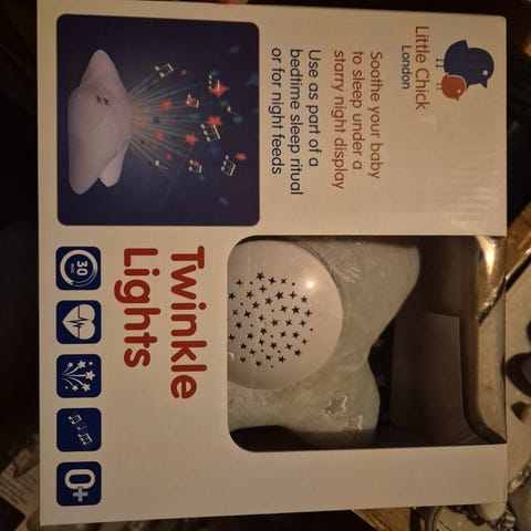 Nattt lampe med musikk til bebyseng. Batteri drevet, kan lett festes. Leker kan festes på sirkel som snur seg.
