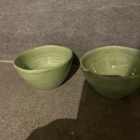 Selger diverse håndlagede keramikkopper fra keramikkverkstedet. Disse er støpt eller dreid og laget av steingodsleire som gir et sterkt og holdbart produkt. Det er kun brukt mat/drikkesikre glasurer. 1.og 2.sortering. 2.sortering har noen små produksjonsfeil (f.eks. ujevnheter eller «nupper i glasuren»).