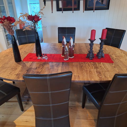 Stort deilig bord med 6 stoler og et hjørneskap tilsalgs. Bordet er synlig brukt, men det kan fint behandles med litt maling. Stolene er pent brukt. Hjørneskapet fremstår også som pent brukt. Dette er håndlaget, som vi fikk laget til oss for ca. 25 år siden. Et solid bord, et samlende bord for de rette menneskene og som passer til både et romslig kjøkken, spisestue eller på hytte. Den er malt i rødt med sort pigment i malingen, stolene er malt i sorte sitteplater. Hjørneskapet har 2 skap, øverst har du plass til skjeer ol. I midten kan du sette en osteklokke som jeg har eller andre ting, god plass i skapet under.