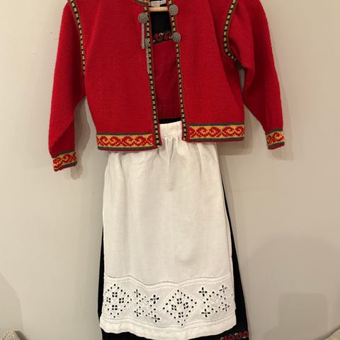 Hjemmestrikket kofte og kjole i str 2-5 år selges samlet. Ingen hull, men litt lo/nupper på ullen som nok kan fjernes. Kjempefint sett. Kan sendes med posten.