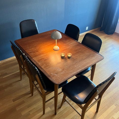 Selger to flotte vintage spisestol i teak med sort polstret sete, etter min bestefar. Stolen er et ekte stykke skandinavisk mid-century modern design, med elegant og tidløst uttrykk. Den er solid bygget og har en pen patina som vitner om god kvalitet.