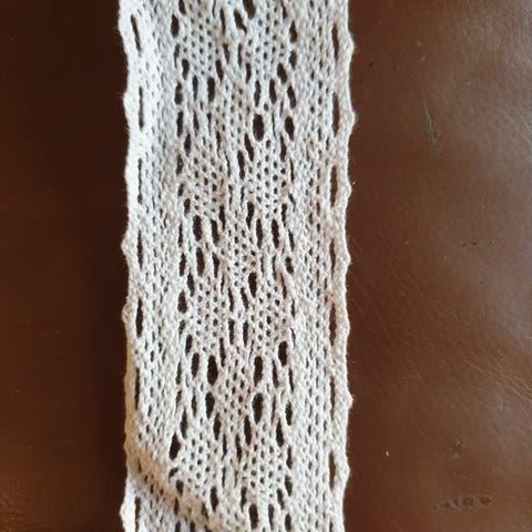 Selger en rull med blonder i kremfarget/natur i bomull, bredden er 1.7 cm.