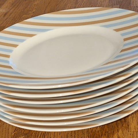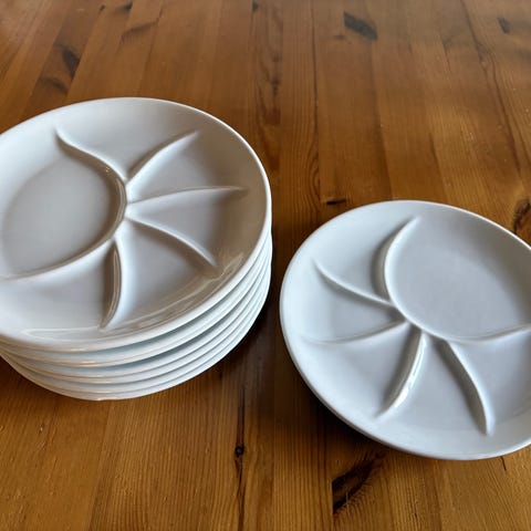 6 store middagstallerkner selges. 27 cm i diameter. Det er ganske mye krakelering på fire av dem. (Se de siste 4 bildene.) Serviset tåler oppvaskmaskin og mikrobølgeovn.
