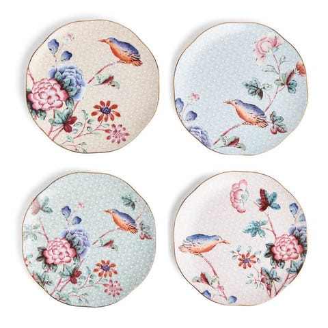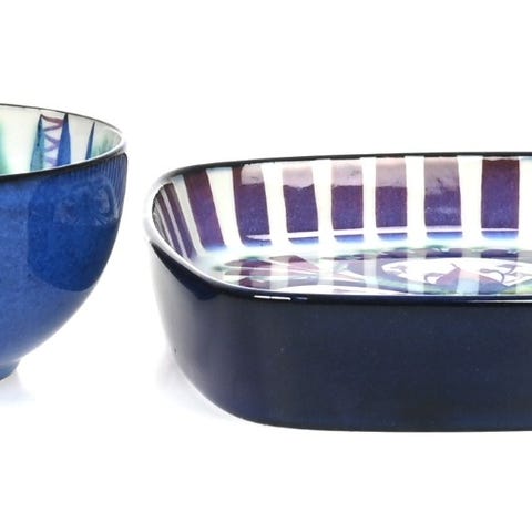 Vintage sett med 4 kuvertskåler fra Aluminia Royal Copenhagen. Designet av Beth Breyen og heter treffende nok " Crazy Birds ". Høyde ca 2 cm, måler ca 9,5 x 6,5 cm. Laget i fajanse, meget pene uten skader og i original eske.