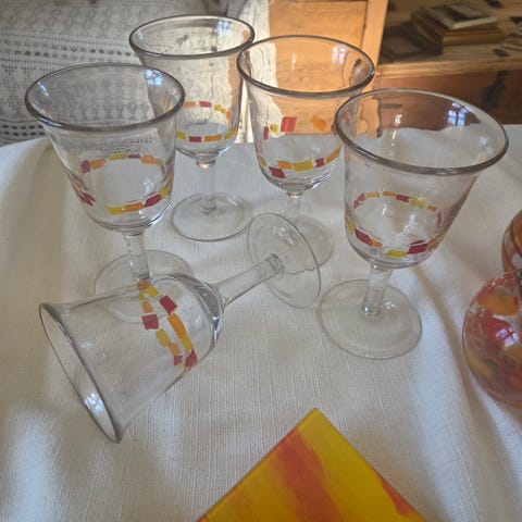 Vintage glass vinglass sett i blå farge. Settet består av fem glass med en dekorativ design, perfekt for servering av vin ved spesielle anledninger. Glassene har en unik stil som gir et elegant preg til borddekkingen.