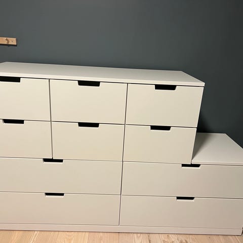 Montert noe feil med listene på sidene, så de må bare bytte plass for å få plass til alle skuffene☺️ fire litt mindre skuffer, og to større. Alt følger med, inkl den siste skuffen som ikke er i.