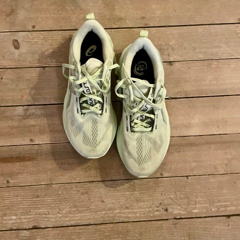 Veldig gode sko i str. 38 2/3. brukt på en treningsøkt og ett løp, til sammen ca 26 km. Det regnet under løpet, derfor er de litt møkkete foran, men ellers er de så gode som nye. Selges fordi de ikke passet foten min