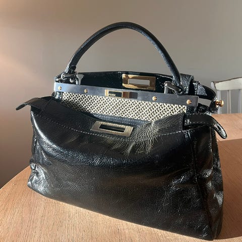 Fendi wallet on chain med avtagbar stropp. Denne kan derfor brukes både som veske og som clutch. Vesken er i sort, lakkert skinn med litt gullshimmer og har gull-hardware. Pent brukt, men med noe få bruksmerker i lakken.