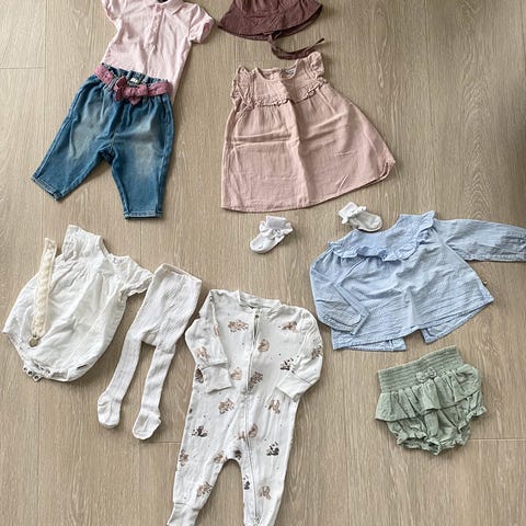 Klespakke bestående av en kjole i velour (som ny), et sett fra Newbie med body og bukse, to bukser (en er tykk og fleecefóret), to luer fra HM og Monsoon, og to pysjer. Alt er str. 68 bortsett fra pysjer som er 62/68.