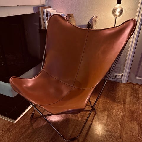 Stolen er godt brukt, men her fortsatt mange år igjen. Den har ingen skader. Puffen har praktisk rom til oppbevaring. Må hentes, sendes ikke.