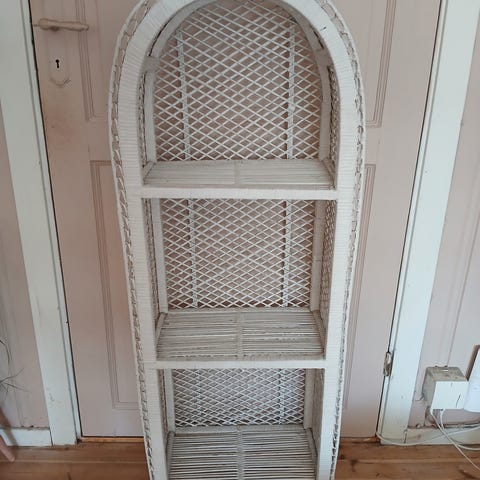 Selger en classic vintage buet hvit hylle i naturmaterialer. 3 hylleplater med plass til oppbevaring. Kan pyntes med planter / lys etc..