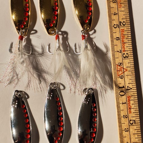 Selges samlet for 110 kr for 10 stk spinnere, 6 cm lange.