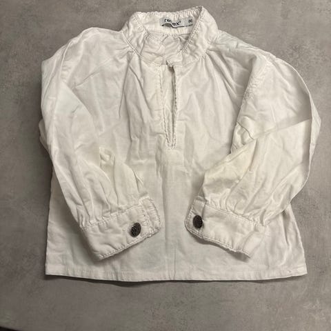Bunadsskjorte med en flekk på armen, ikke prøvd å fjerne. På samme arm er det antydning til et hull, se bilde. Eller i god stand.