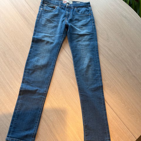 Blå jeans fra Levi's med tapered fit, som betyr en passform med avsmalnende ben. Tapered jeans er romsligere enn en slim fit med litt mer plass ved rumpe og lår. Buksen har knappgylf, og i midjen finnes en justerbar strikk som gjør at komforten og passformen blir så bra som mulig.