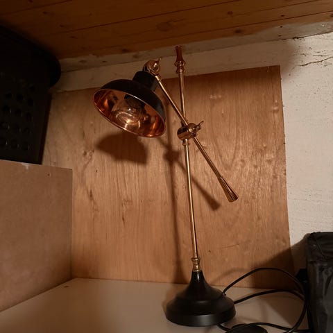 Selger denne lampen som er i fargen kobber metall. Har hatt den stående i vindu ved inngangsdøren, selges nå grunnet flytting.
