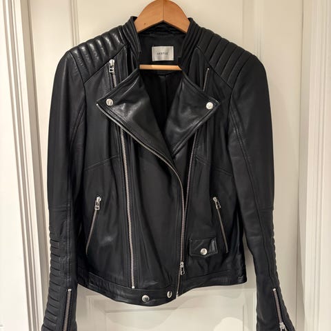 Nydelig helt ubrukt Gestuz skinnfrakk, str 38. Mykt skinn i fargekombinasjon beige/sort. Sidelommer og fine detaljer med glidelås nederst på ermene. Ekstra knapper medfølger- henger fortsatt på etiketten.