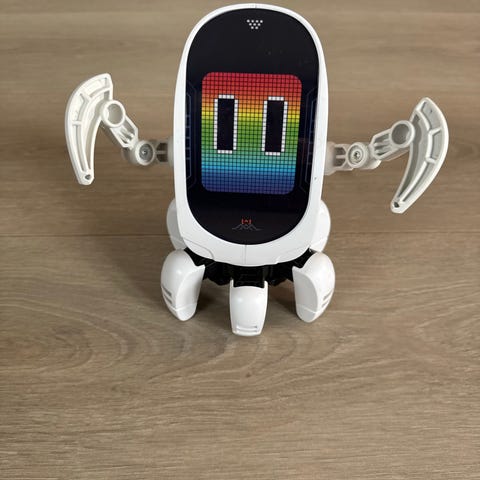 Evolution robot. Har 4 elektroniske motorer og er programmerbar fra en gratis App. Dette gjøres mulig via Bluetooth. Noen ganger fungerer ikke armene optimalt, og når den reiser seg opp, så må få litt hjelp. Resten fungerer fint. Går på batterier. 17 cm bred, 26 cm høy. Med lyder, musikk, talemeldinger og ansiktsuttrykk vil Evolution Robot være en flott gave til barn.