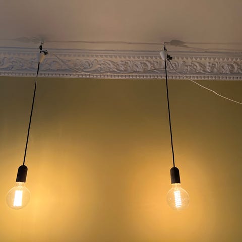 Svart metall lampeskjerm. Svart tekstilkledd ledning