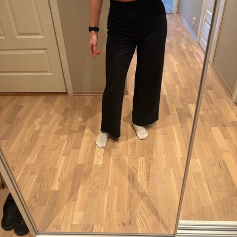 Sorte tettsittende bukser laget av elastisk materiale som strekker seg godt og fremhever figuren. Komfortabel passform, lengde til ankelen. Perfekt både til hverdags og kontor.