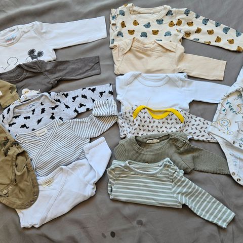 7 bodyer i ull, to bukser i ull, en «strikket» bukse i bomull. Et sett i ull fra JOHA str. 60.