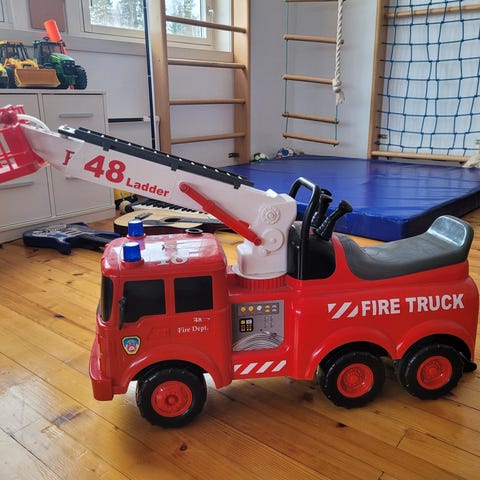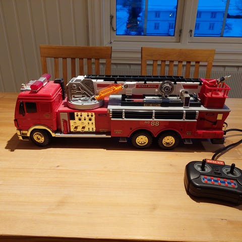 Stilig fernstyrt brannbil med beholder til vann kan gjøres om til stilig robot ved å trykke på en knapp, se bilde.