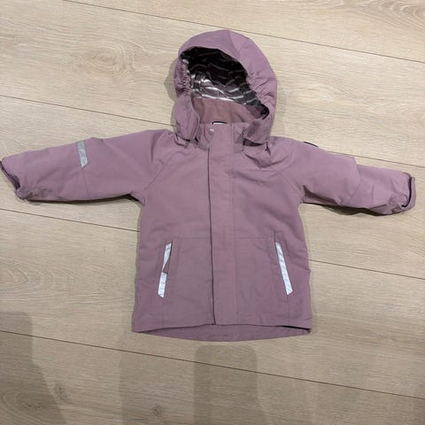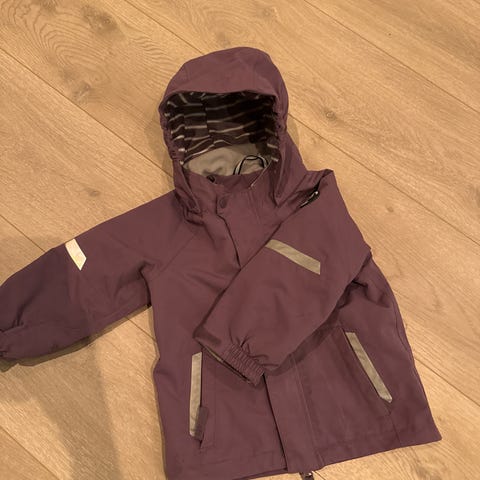 Skalljakke størrelse 110. Fin uten på, noe bruksmerker. Og noe slitt på innsiden på halsen. Ny pris 999kr