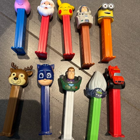 6 stk PEZ-dispensere hvor en av de fortsatt er uåpnet. Det følger også med en uåpnet pakke med PEZ i tillegg, se bilder.