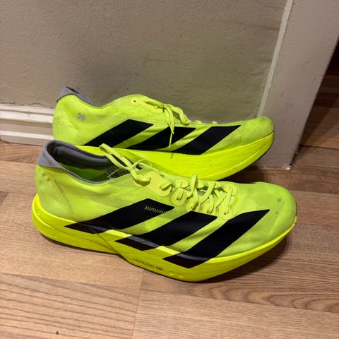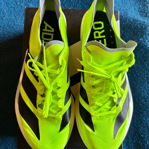 Adidas Adizero EVO SL størrelse 42 selges da de ble for små til meg, brukt rundt 30km(ca10k på mølle). Ubetydelig brukt med andre ord, veldig mye sko igjen her.