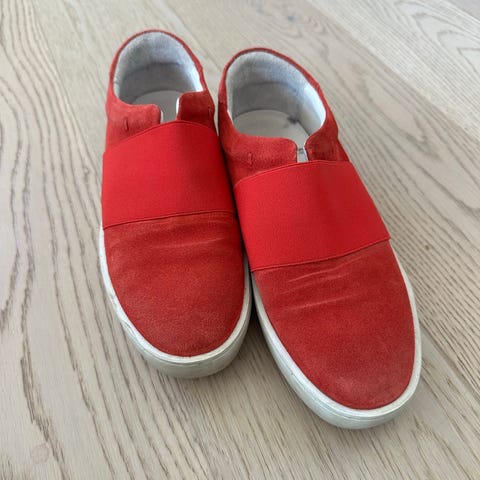 Materialet ligner fløyel. Skoene er litt tunge. Bruksmerker på det hvite rundt kanten på skoen. Kr. 20 pluss porto.