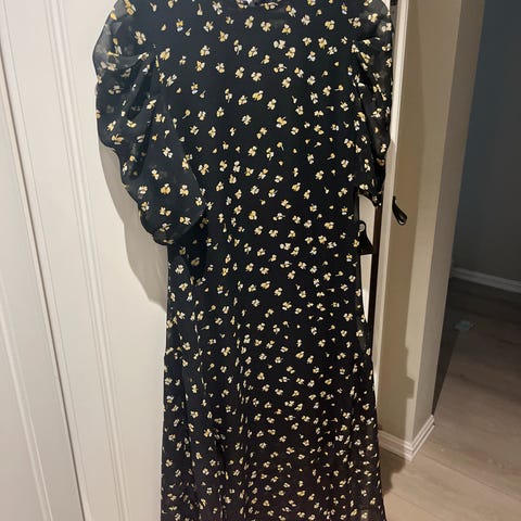 Ubrukt kjole fra HM selges. Ble dessverre feil farger for meg. Lappen er tatt av, men aldri brukt. Nydelig kjole med fine blomster på som kan passe til alt fra hverdag til fest/bryllup. Kjolen har et dobbelt lag ned mot knærne ca så den ikke blir gjennomsiktig