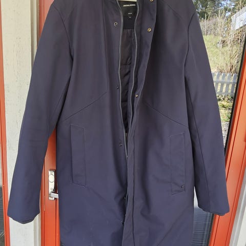 Jack & Jones Vinterjakke for menn i størrelse L. Jakken er blå og designet for å gi varme og komfort i vintermånedene. Den har praktiske lommer og en hette for ekstra beskyttelse mot vær og vind.