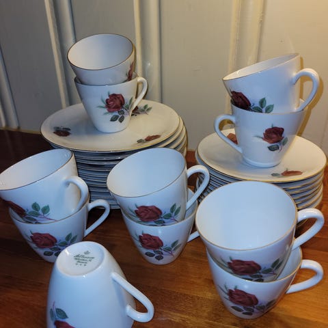 Tekanne sett i friske farger, medfølgende vannkaraffel/vannmugge, 2 telysholdere og 6 gode krus