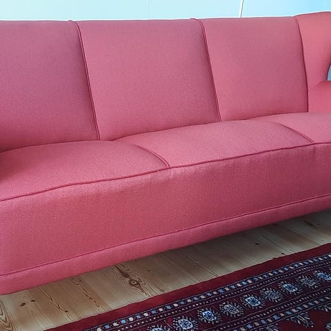 Eldre antikk sofa i biedemeier-stil selges. Den har tungt og massivt treverk som er i ok stand, men har noen sprekker og hakk. Fjærer, stopping og polstring er dårlig og må restaureres.