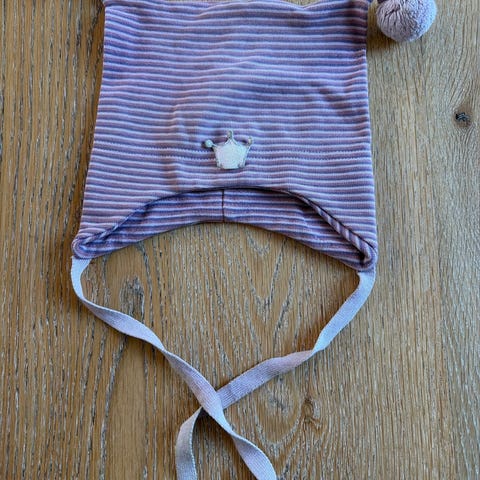 Selger en nydelig lue i lilla/rosa striper fra Kivat med rosa dusker.