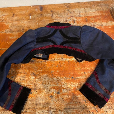 Minimum 100 år gammel, antakelig eldre, sydd av en veldig dyktig skredder, sammenlignet med andre skreddersydde bunader fra samme område. Nesten ingen som kan sy denne bunaden med disse håndverksteknikkene i dag.