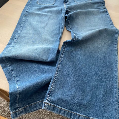 Vid silkemyk jeans fra HM. God vidde i bena, høy midje. Midjemål 90 cm. Er merket str 44, men plasser modellen som er str 42.