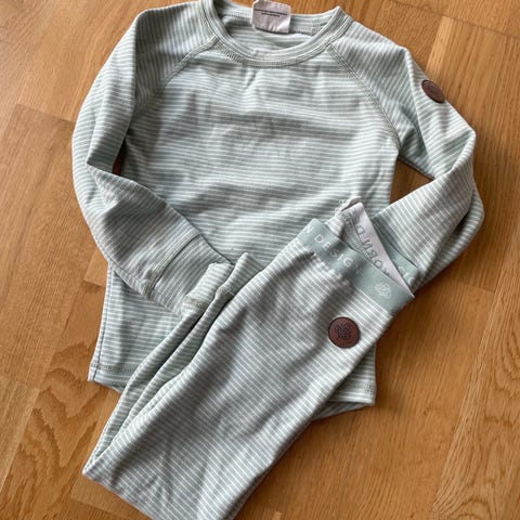 SUPERMYKT undertøyssett - perfekt som innerste lag og herlig for barn med sensitiv hud. Stoffet puster godt og er fantastisk behagelig på. Kan brukes som pysjamas, under parkdressen, under hverdagsklær, under ull, eller bare være et supersmart ekstraskift i barnehagen! Enkel strikk i livet på bukse og ellers ingen unødvendige detaljer. Normal til medium i størrelsen pga. elastisitet i stoffet. Holder seg godt i vask, og kan gjerne arves mellom barn.