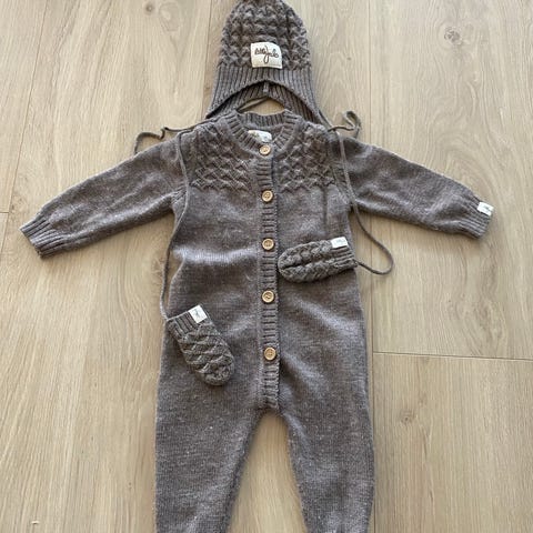 Heldress til baby, passer ca fra 62/68. Og ullsokker i tilsvarende str. Perfekt til høsten, med traktor knapper😍
