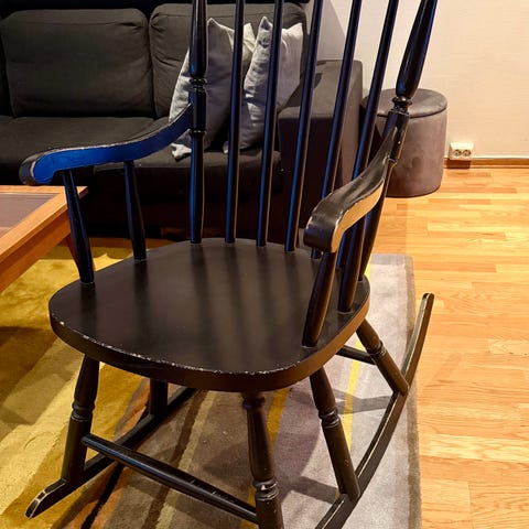 Selger en solid, klassisk gyngestol i tre, med flott patina som gir den et rustikt og autentisk uttrykk. Perfekt for deg som liker møbler med historie, eller som ønsker et oppussingsprosjekt med potensial til å bli et unikt blikkfang.