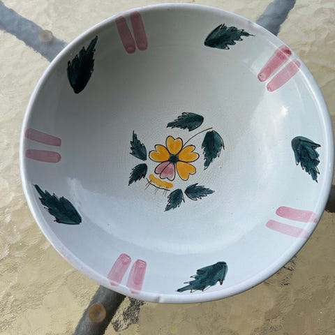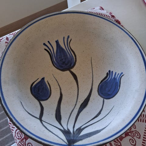 Fat håndlaget i Norge. Dekorativt design med stiliserte blomster og blader. Fatet er laget av keramikk og er solid. Noe krakelering i bunn selges derfor rimelig.
