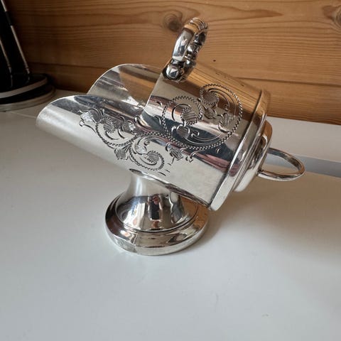 En sukkerskål med lokk brukt til å servere sukker eller sukkerbiter. Lokket er av sølvplett.