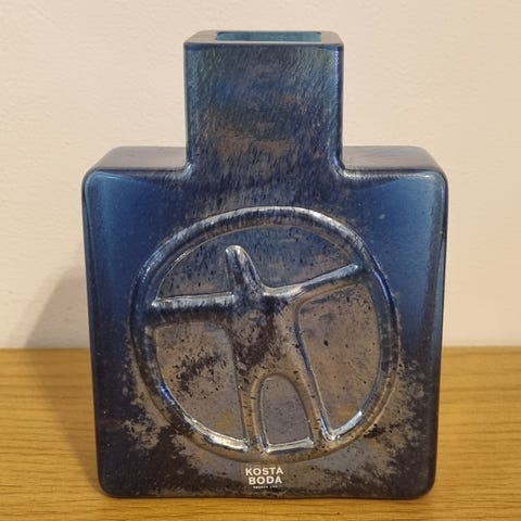 Håndlaget glassvase med en unik blå og grønn fargekombinasjon. Vasen er dekorert med gullfargede detaljer som gir et kunstnerisk preg. Passer godt som et dekorativt element i hjemmet...HADELAND?