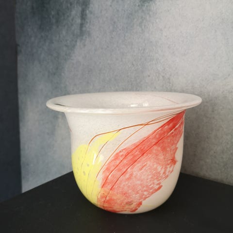 Signert skål / bolle i kunstglass fra Viivi-Ann Keerdo. Fantastisk fargespill og dekor; rødt, orange, blått, grønt, sort, lime, turkis.